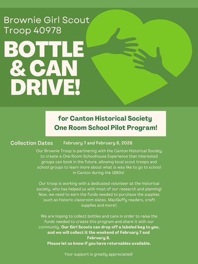 The Canton Historical Society Museum also is the site of our pioneer schoolhouse educational program for youth and Troop 40978 is helping support us. Please lend a hand to make this fundraiser a huge success and help fund the supplies needed to support this valuable program.